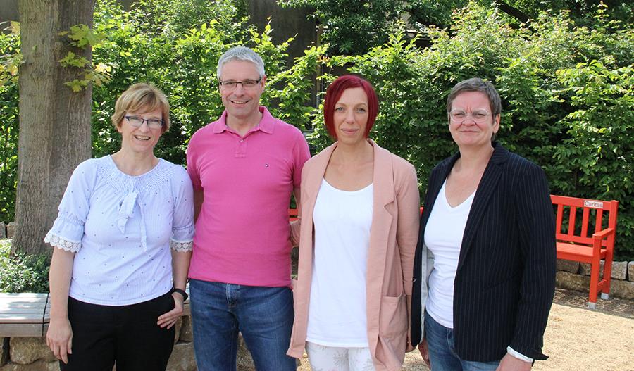 Ein paar derzeitige Schülerinnen und Schüler, die es vorgemacht haben und als Quereinsteiger die Pflegeausbildung absolvieren: v. li. : Elke Kell; Jürgen Trautmann; Yvonne Veltum-Frohnapfel; Christine Lange (alle Schüler des Lehrganges 34, erstes Lehrjahr). C. Scharf/Caritas FD