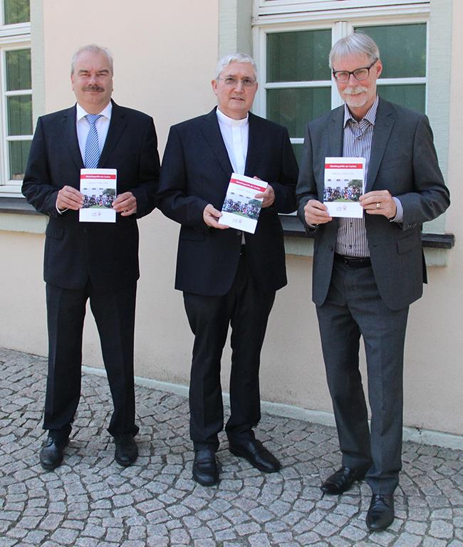 (v. li.) Caritasdirektor Juch, den Aufsichtsratsvorsitzenden Gurk und den Flüchtlingsbeauftragten Meyer bei der Präsentation der neuen BroschüreC. Scharf/Caritas FD