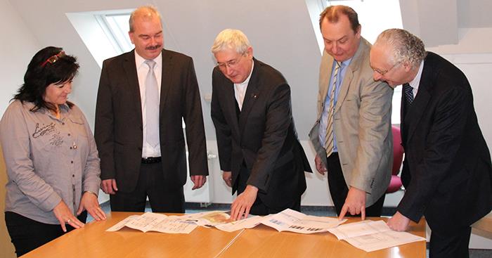 Während der Sichtung der Planungen im Caritashaus (v. li.): Marina Göbel, Einrichtungsleiterin des Pflegeheims „Herbert Nellessen“, Diözesan-Caritasdirektor Dr. Markus Juch, Caritas-Aufsichtsratsvorsitzender Msgr. Elmar Gurk, Vorstandsmitglied Ansgar Erb sowie Vorstandsmitglied Malte CromeM. Klüber / Caritas FD