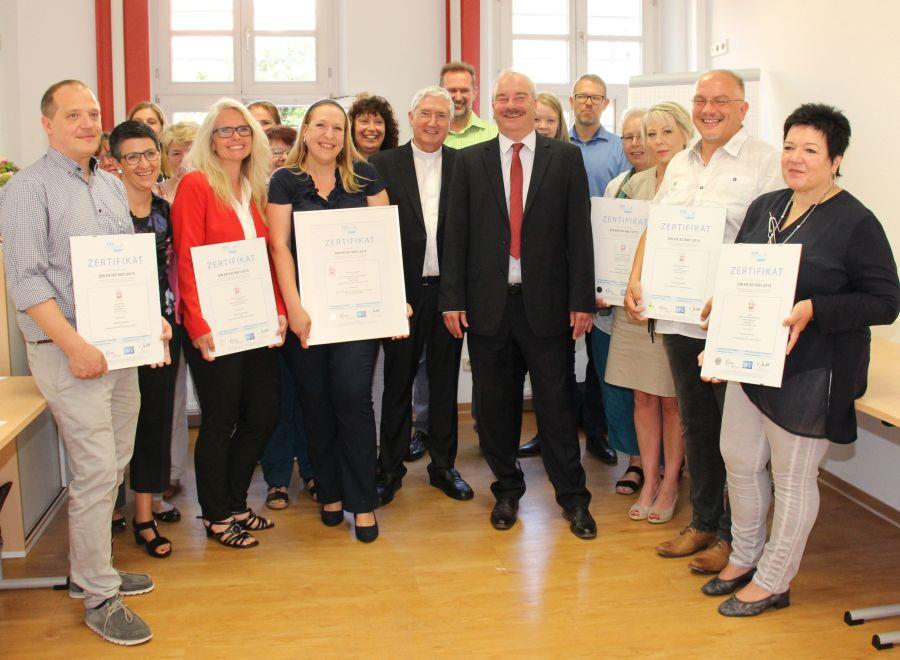 Diözesan-Caritas-Direktor Dr. Markus Juch und der Caritas-Aufsichtsratsvorsitzende Msgr. Elmar Gurk überreichten den Einrichtungsleiterinnen und -leitern sowie weiteren Vertretern der Teams aus den Pflegeheimen die Zertifizierungsurkunden, die nunmehr wieder drei Jahre - also bis 2021 - gültig sind. Markus Juch dankte dem Ressort-Leitungsteam und den beteiligten Pflegeeinrichtungen mit allen ihren Mitarbeitern für die gute Arbeit, die sich im Prüfungsergebnis sichtbar niederschlage. Auch Msgr Gurk lobte, dass die Urkunden den hohen Qualitätsstandard der Caritas-Altenpflege belege und zeigte sich beeindruckt darüber, dass diese durchweg gute Arbeit auch ungeachtet der ständig wachsenden Anforderungen an die Mitarbeiter geleistet werde. Unser Foto entstand nach Übergabe aller Zertifizierungs-Urkunden und zeigt die Herren Juch und Gurk von der Verbandsspitze gemeinsam mit den Vertreterinnen und Vertretern des Ressorts Altenhilfe und der sieben Caritas-Altenpflegeheimen im Bistum.