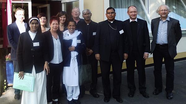 Gruppenbild mit pakistanischen Gästen vor dem Haus Carl Sonnenschein: von li. Werner Meyer vom Farwig, Sr. Robina Victor, Klaudia Friemel, Ursula Mex, Anne Rademacher, Sr.Genevieve Ram Lal , Dieter Kumpe, Pater Akhtar Naveed, Bischof Joseph Arshad, Ordinariatsrat Peter Göb, Caritas-Vorstandsmitglied Malte Crome.Dr. Christian Scharf/Caritas FD