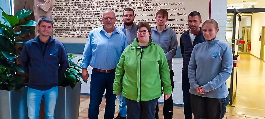 (von links) Jens Hosenfeld, Produktionsleitung Möller-Medical, Albert Wiegand, Produktionsleiter Caritas, Lucas Buchholt, Azubi Möller-Medical, Caritas-Mitarbeiterin Madeleine Klüh, Joschua Ballmeier, Azubi Möller-Medical, Christian Diel, Ausbildungsleiter Möller-Medical, und Anouk Steiner, Azubi Möller-Medical.Caritas Fulda