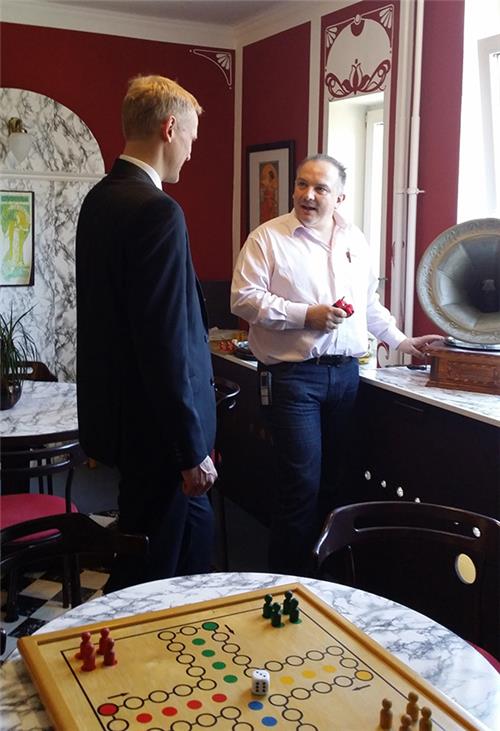 Wir treffen 2 Männer in einem bewusst altertümlich eingerichtetem Zimmer. der eine Mann steht uns zugewandt am Grammophon und spricht mit seinem Gegenüber. Schwarz-weiße Marmorplatten wurden als AblagErinnerungsstücke – Einrichtungsleiter Stefan Smolinka präsentiert im Rahmen des Audits einem der Prüfer die praktische Umsetzung des psychobiografischen Pflegemodells nach Prof Erwin Böhm, das bei der Betreuung demenzkranker Senioren wesentliche Bedeutung hat.Dr. Christian Scharf