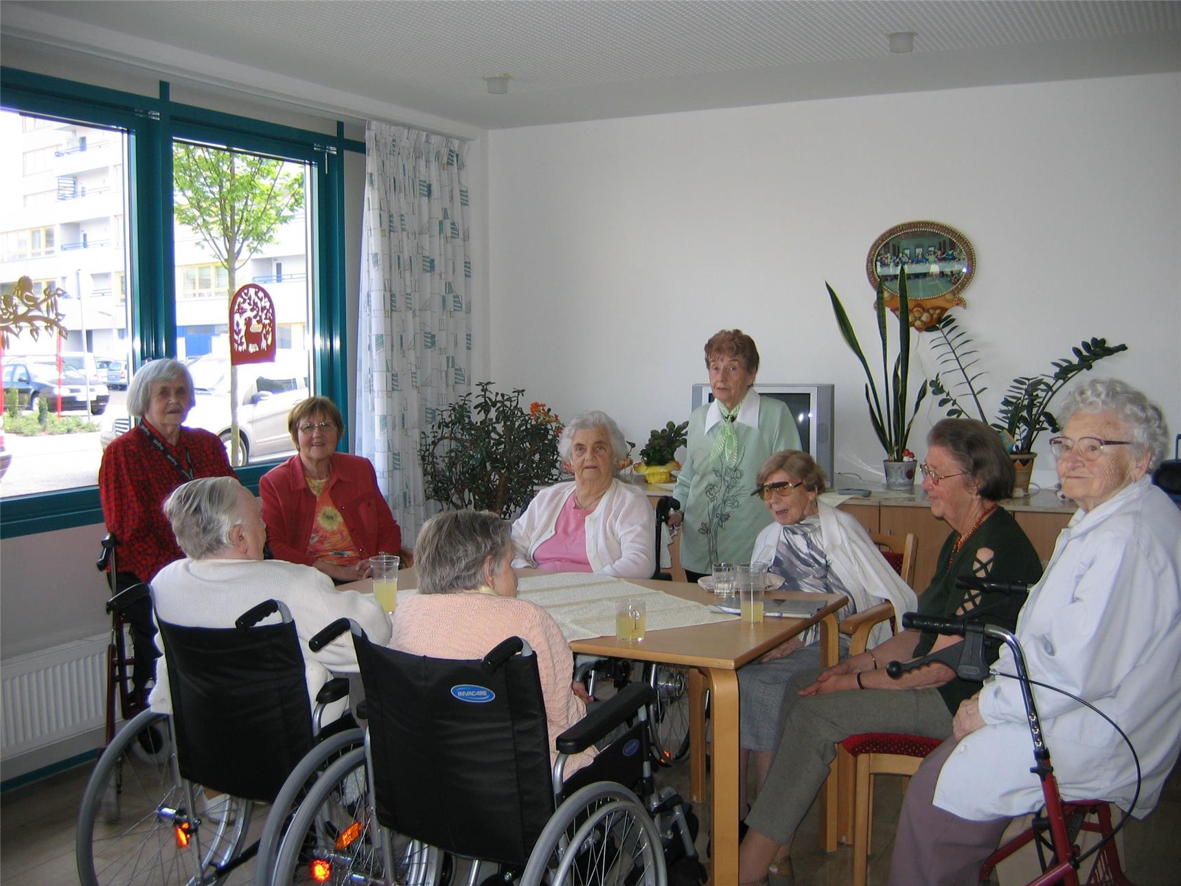Viele Senioren trinken in einer großen Runde gemeinsam Kaffee.Altenzentrum St. Vinzenz Eschwege