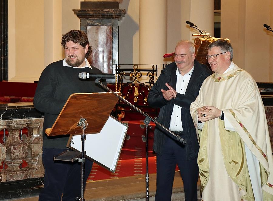der Hauptpreisträger Sporer nach Übergabe der Urkunde mit Caritasdirektor Juch und Generalvikar SteinertC. Scharf/Caritas FD